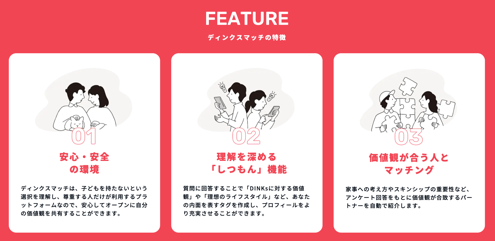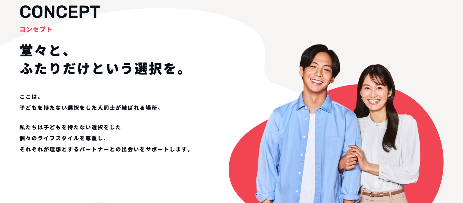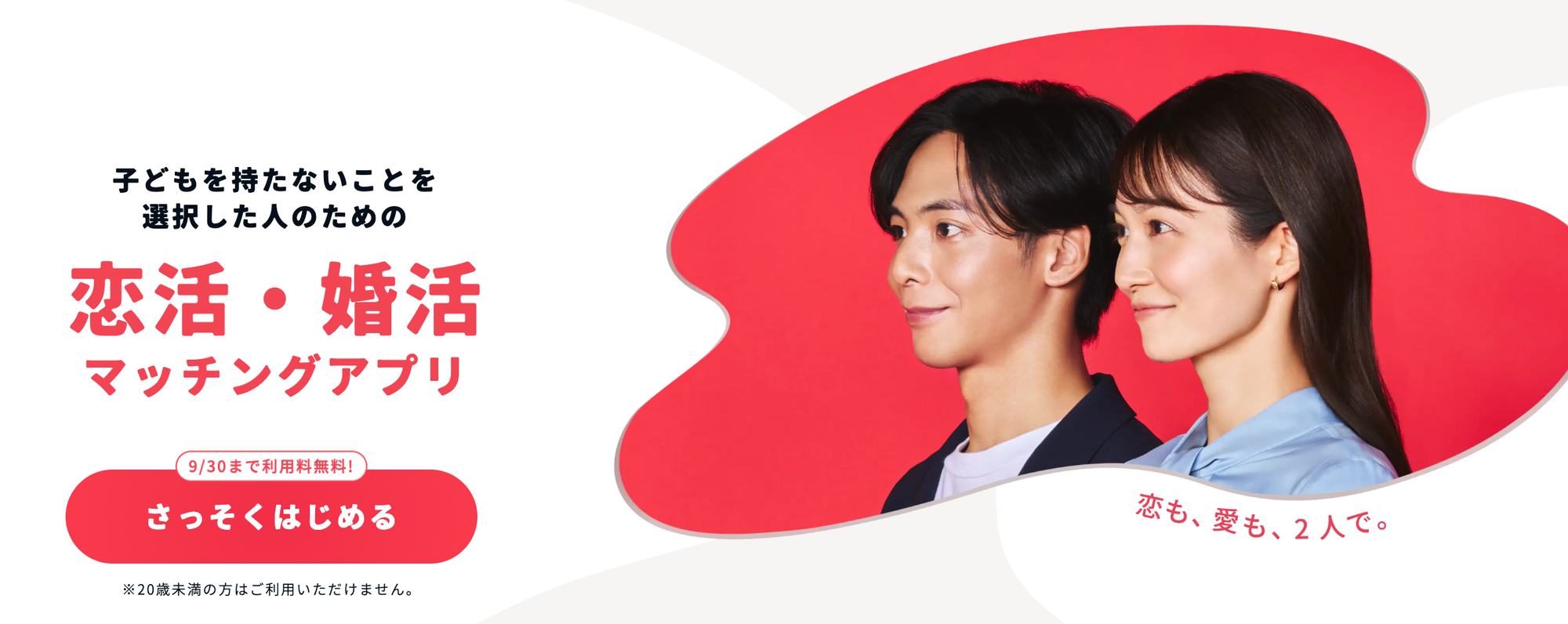 DINKs向けの恋活・婚活マッチングアプリ「ディンクスマッチ」公式サイト。子どもを持たない選択をする個々のライフスタイルを尊重し、理想とするパートナーとの出会いをサポート。女性は無料でご利用いただけます。